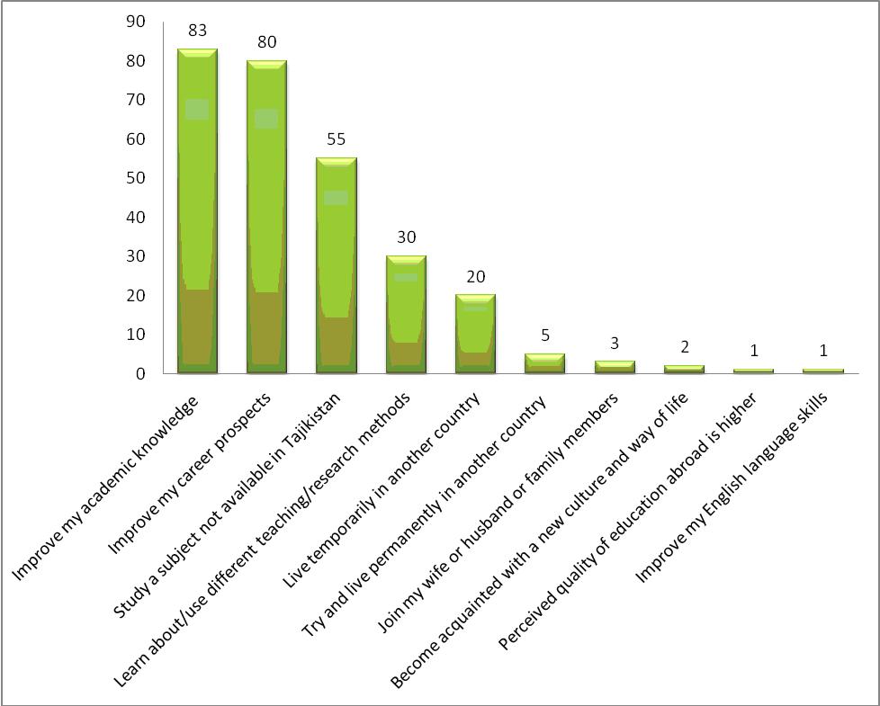 Respondents were asked to choose one or more reasons (from a pre-determined selection) to explain why they were motivated to study abroad, and the results are shown in figure 3. These are all either push or pull factors, i.e. something that stimulates a student to study away from Tajikistan or something that attracts them to study in another country.  Chirkov et al (2008) summarise these factors through two goals: