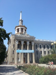 “Welcome, New Students” poster at the International University of Kyrgyzstan, Bishkek, Kyrgyzstan