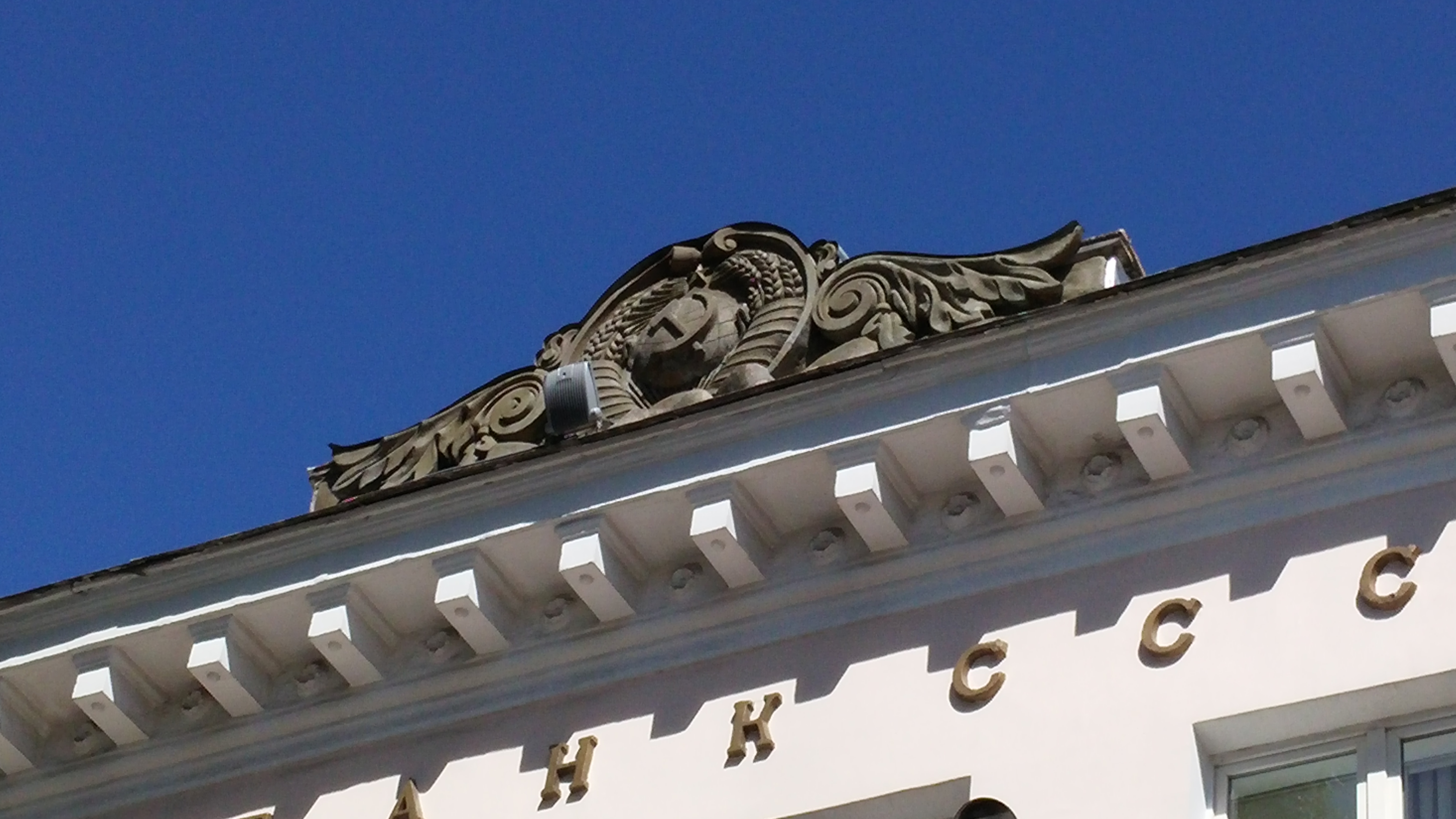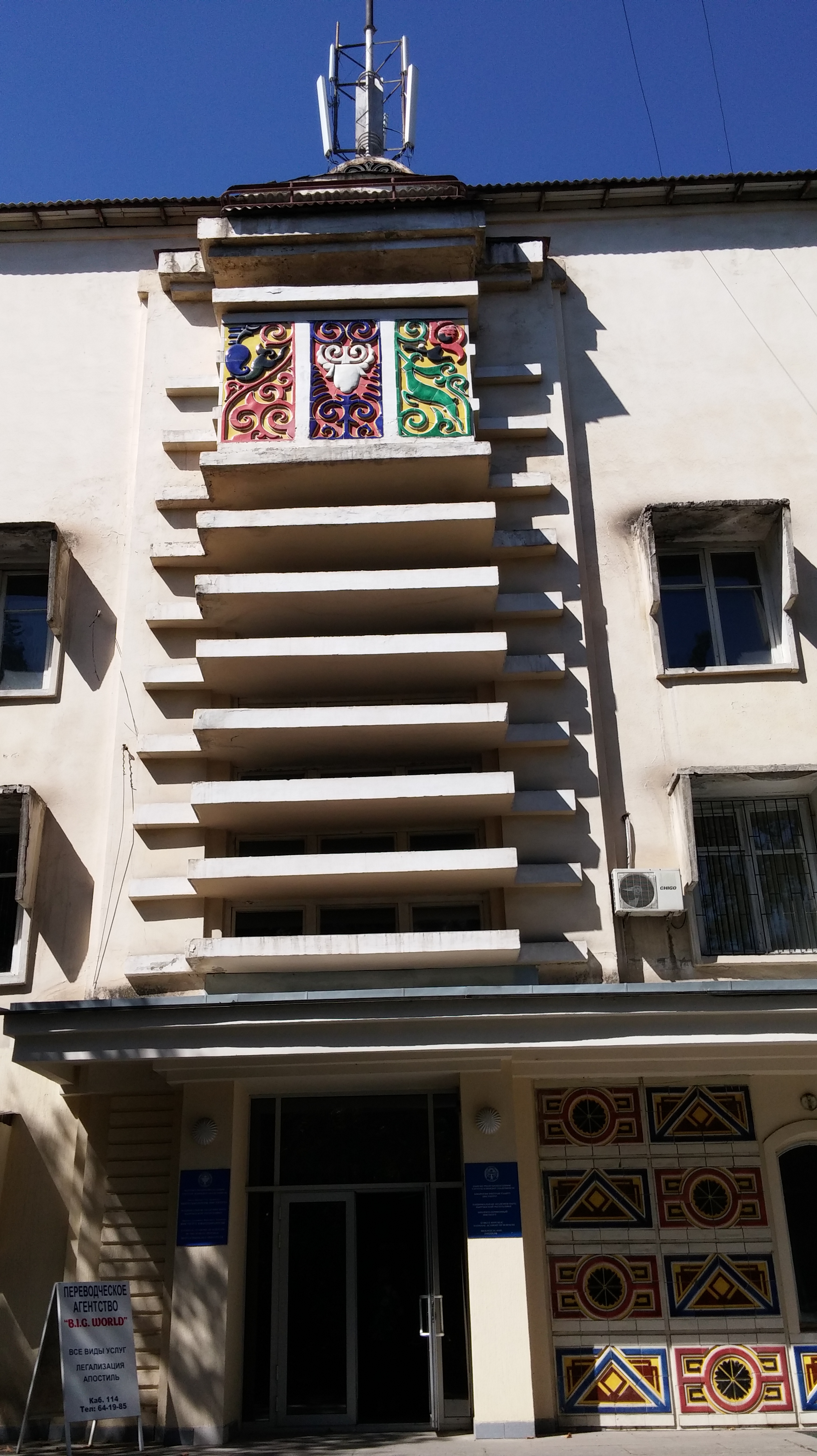 Manas’ wise adviser BakaiFormerly the USSR State Bank, now the Bank of the Kyrgyz Republic. But with its old name and Soviet frontispiece remain.Close up of the Soviet-era decoration on top of the bank buildingNational Academy of Sciences of the Kyrgyz Republic. Founded in the 1920s, read a fascinating chronology of scientific discovery in Kyrgyzstan on the Academy of Science website [en].Mural on the side of the Academy of Sciences buildingLook at the murals!Plaque showing that scientist Aman Mamytov lived in this building from 1957-1999 [text in Kyrgyz and Russian]. Mamytov is best known for classifying soils around the Tian Shan mountain range.