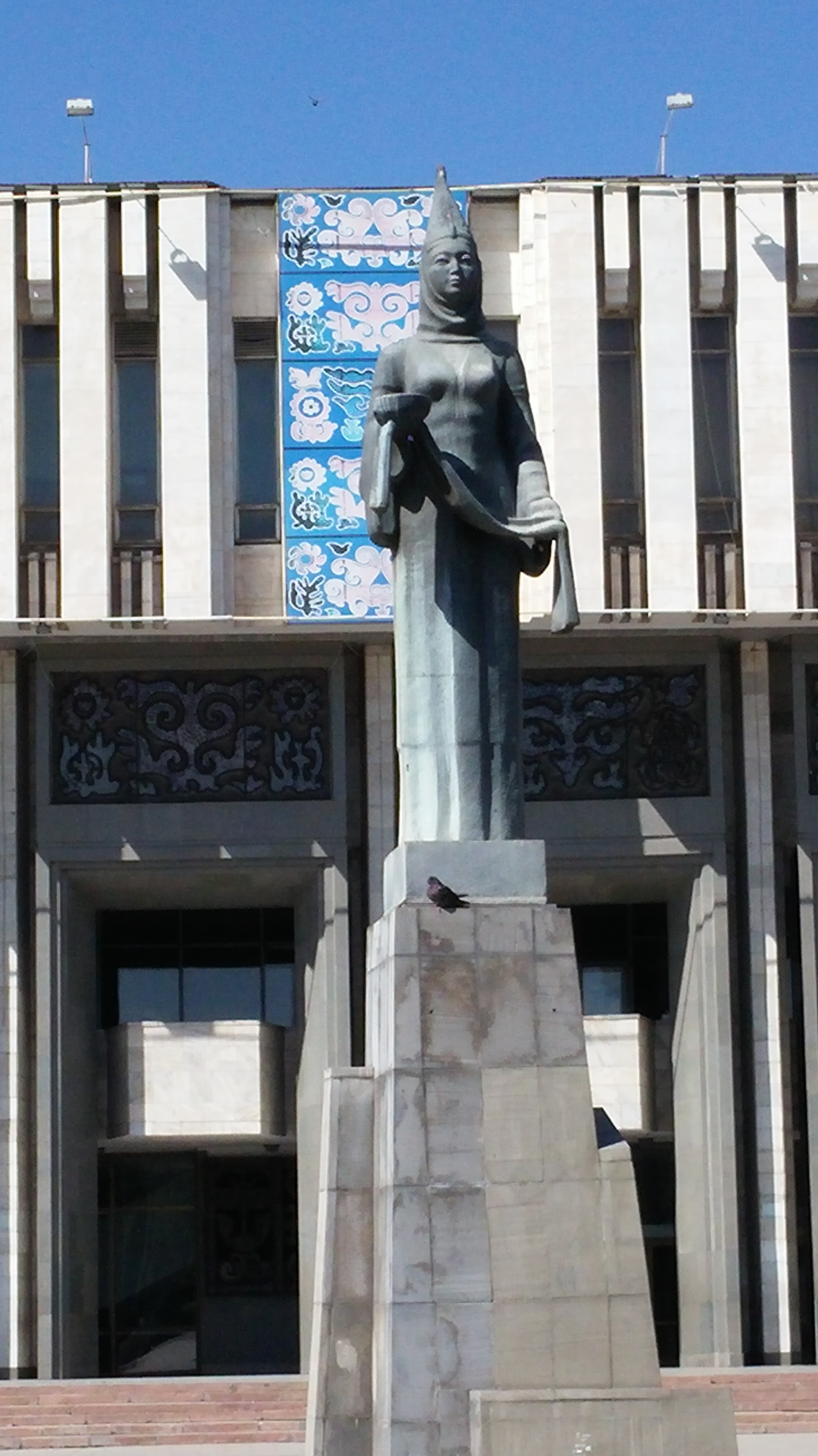 Philharmonic Hall, which can seat more than 1,000 guests. A statue of legendary Kyrgyz hero Manas sitting astride his horse Ak-Kul battling a dragon stands in front of the venue, which was opened in 1980. Click for a good history of the Hall [ru].Close up of Manas’ wife Kanykei in front of Philharmonic Hall. History has it that she was from Tajikistan [ru], although borders then weren’t delineated as they are today.