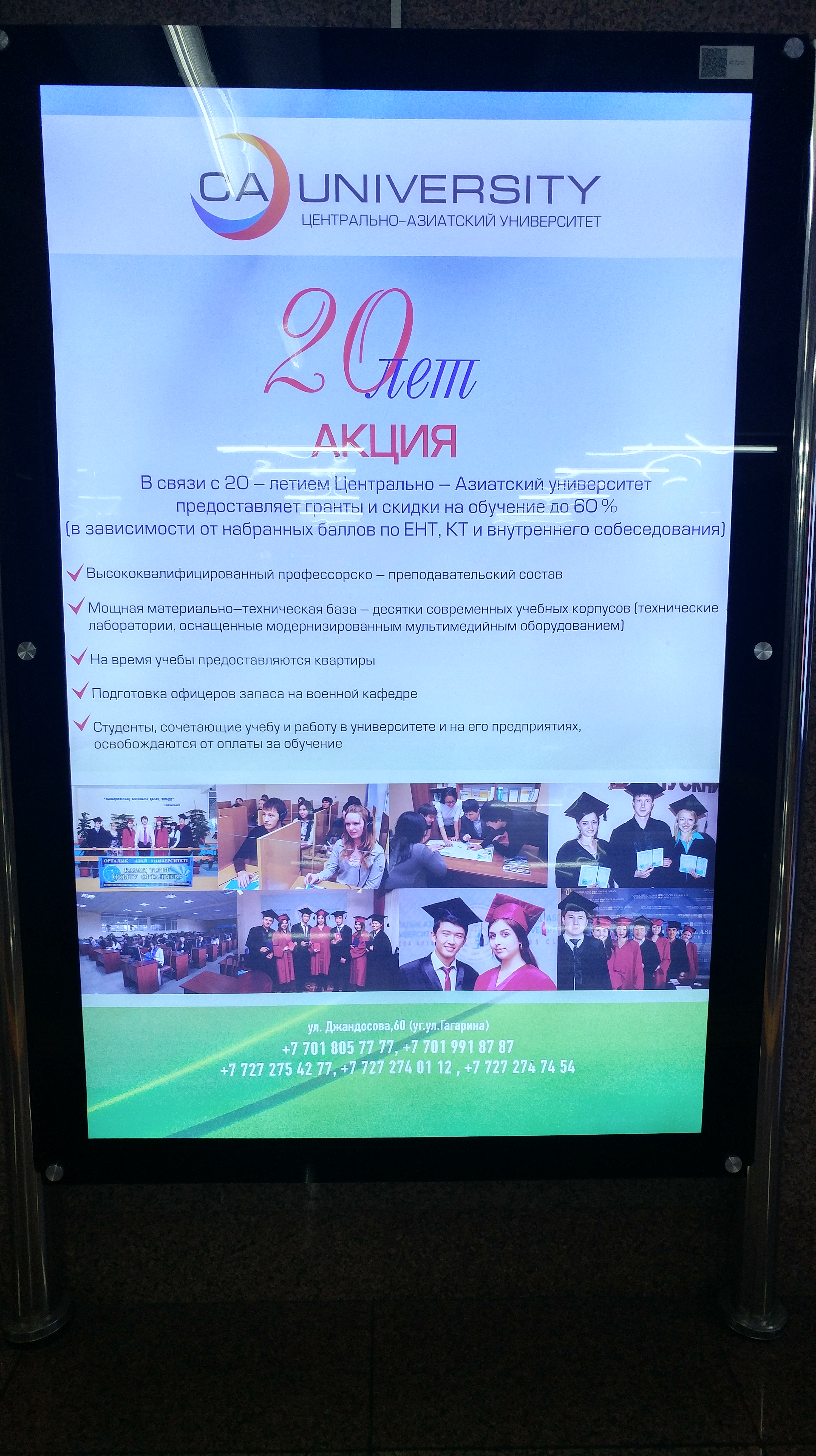 “20 year anniversary discount” (on fees), Central Asian University, Almaty, Kazakhstan (metro poster)