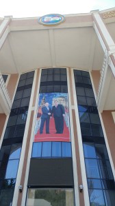 Russian and Tajik leaders hang above the main entrance, Russian-Tajik Slavonic University