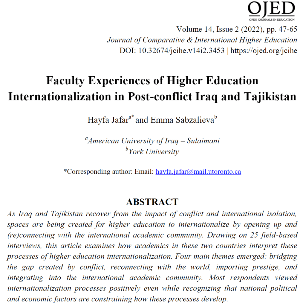 It was with these questions in mind that Hayfa Jafar and I began to explore the role of higher education internationalization in two post-conflict settings at the heart of our academic research: Iraq and Tajikistan. Brought together by mutual interests in internationalization and the shared (post)conflict contexts, we were able to draw from interviews that we undertook during our PhD fieldwork to build a study that compares the experiences of faculty members in these two countries.