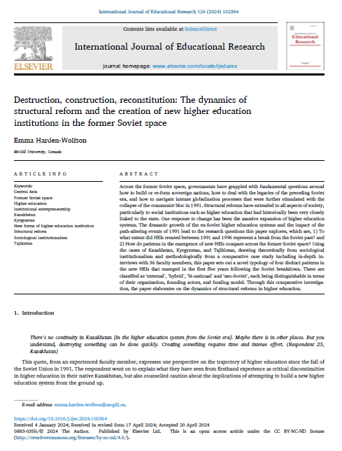Harden-Wolfson, E. (2024). Destruction, construction, reconstitution: The dynamics of structural reform and the creation of new higher education institutions in the former Soviet space. International Journal of Educational Research, 126, 102364. https://doi.org/10.1016/j.ijer.2024.102364